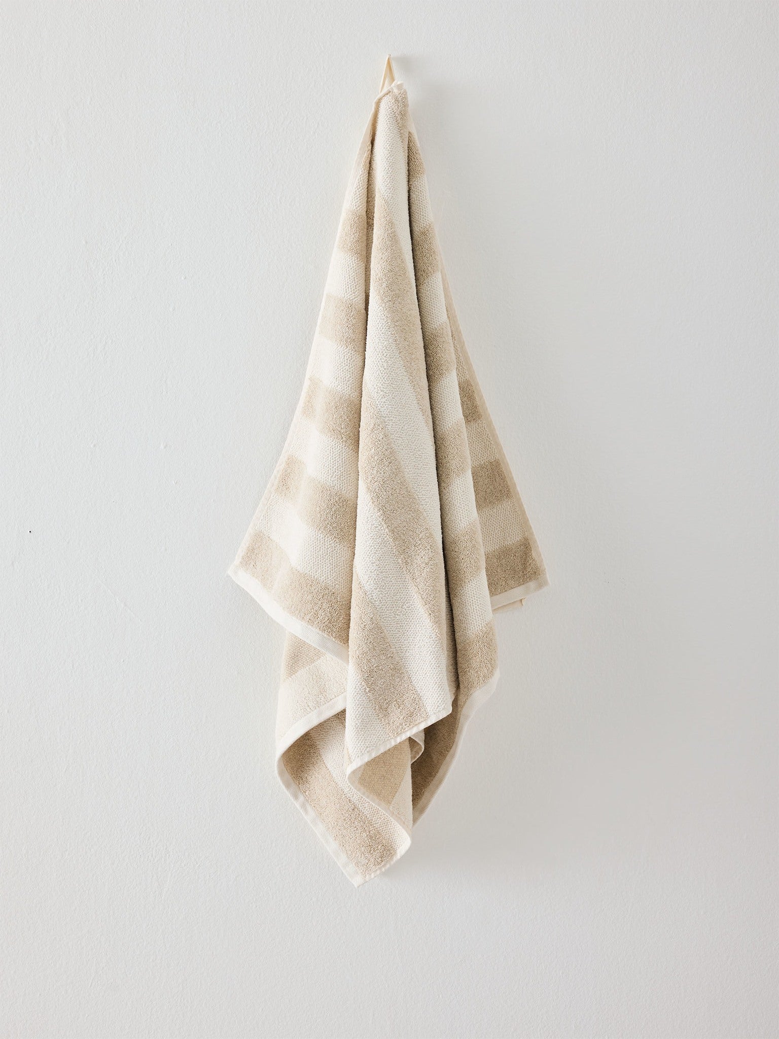 Badlakan vävt i klassisk frotté-teknik, vilket ger en lyxigt mjuk känsla och utmärkt absorptionsförmåga. Den randiga designen i beige och vitt ger badlakanet ett tidlöst och elegant uttryck. Med den generösa storleken 70x140 cm är det perfekt för att svepa omkring sig efter duschen eller badet. Cleo finns även som handduk i storleken 50x70 cm.